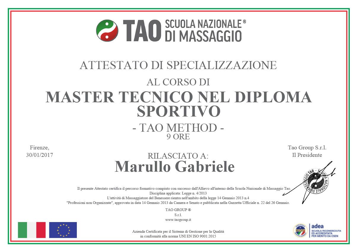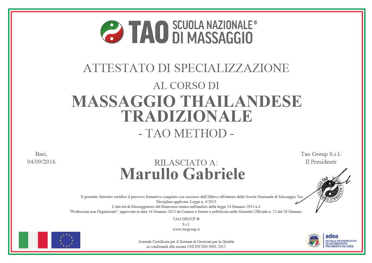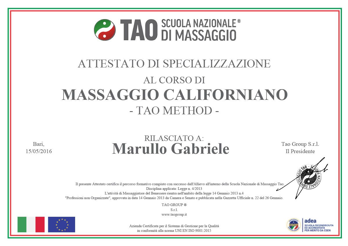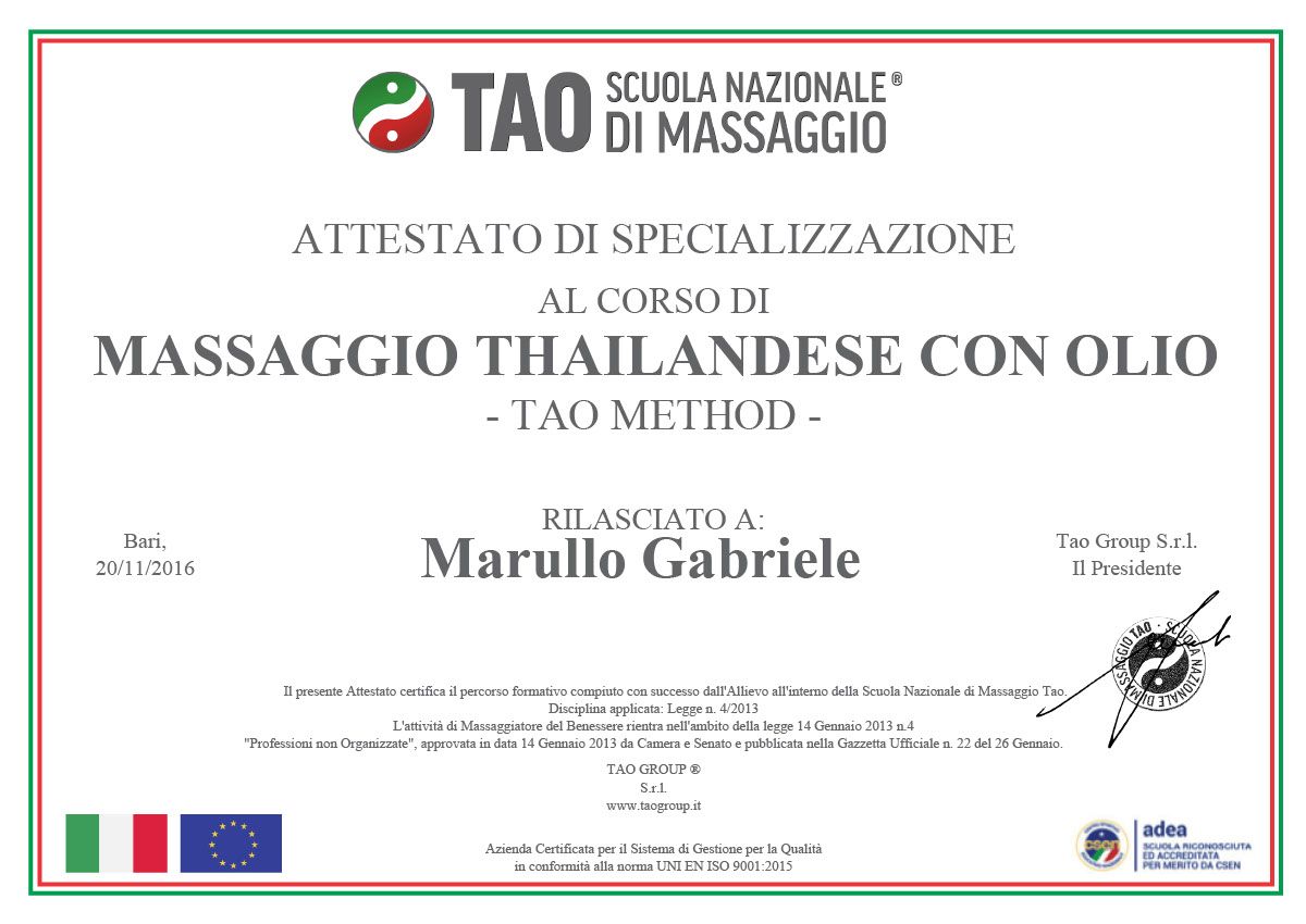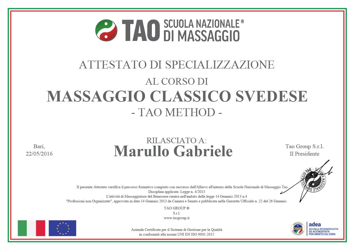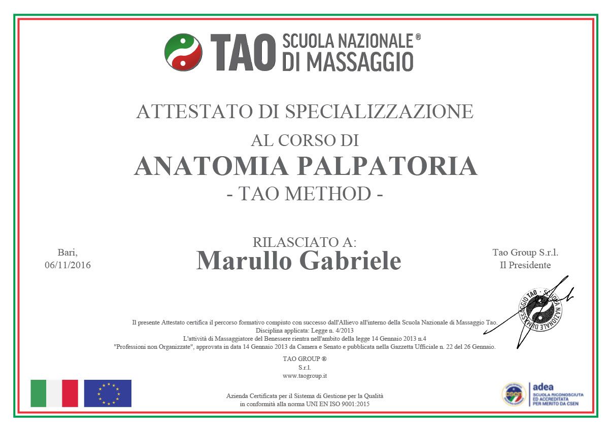 ha frequentato con successo la Scuola Nazionale Tao nel Campus X Bari conseguenguendo il Diploma di Operatore in Massaggio Professionale.